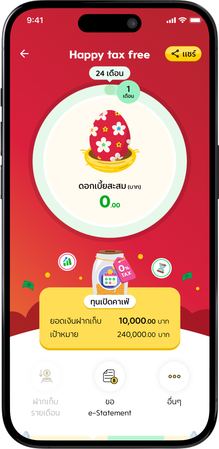 | 24 เดือน | 2.00% ต่อปี* | ฝากขั้นต่ำ 500 บาท สูงสุดไม่เกิน 25,000 บาทต่อเดือน |