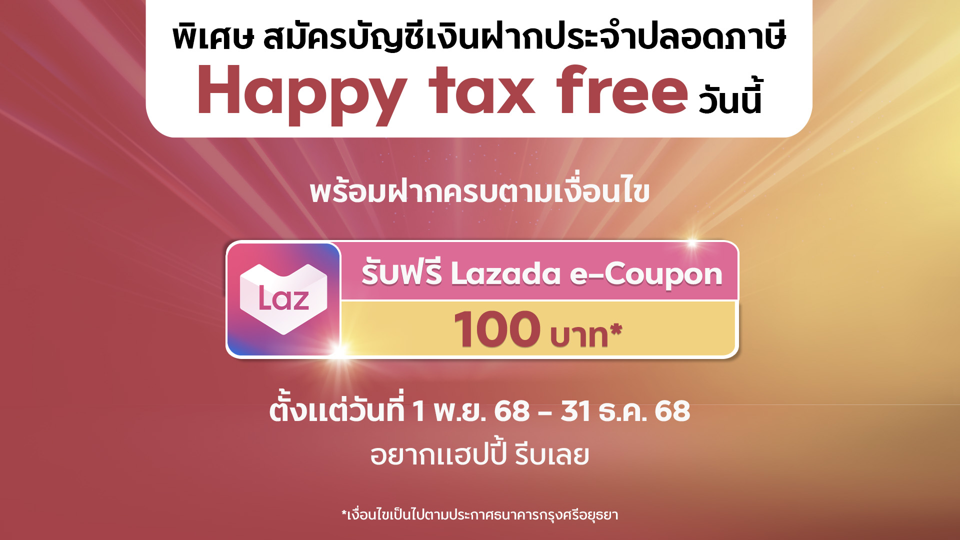 *อัตราดอกเบี้ยและเงื่อนไขเป็นไปตามประกาศของธนาคารกรุงศรีอยุธยา ณ วันที่ทำรายการฝากในแต่ละครั้ง ทั้งนี้ การยกเว้นภาษี ณ ที่จ่ายเป็นไปตามกฎเกณฑ์ที่กรมสรรพากรกำหนด